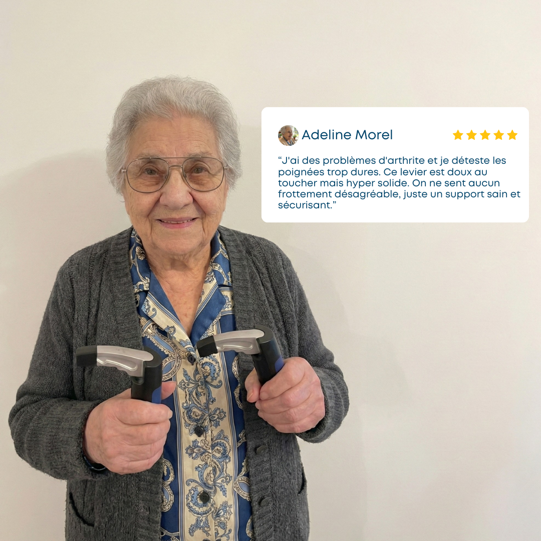 C'est précisément pour cela qu'elle a été conçue. L'installation se fait en 1 seconde : on glisse, et c'est prêt. Le manche est doté d'un revêtement antidérapant "Grand Confort" qui permet une prise ferme sans avoir besoin de serrer les doigts. L'effort est transféré à vos bras, épargnant vos articulations douloureuses.